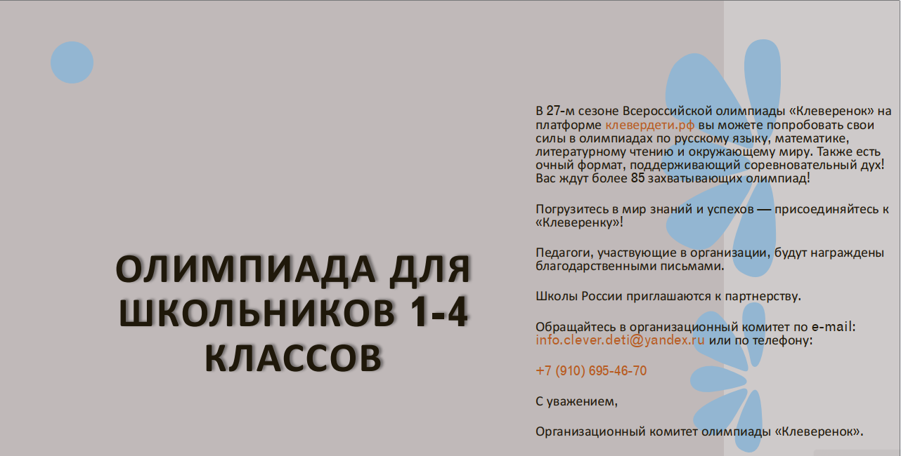 Всероссийская олимпиада для 1-4 классов «Клеверёнок. Сезон 27» Погрузитесь в мир знаний и успехов — присоединяйтесь к «Клеверенку»! https://cdytsimf.crimeaschool.ru/news/67874