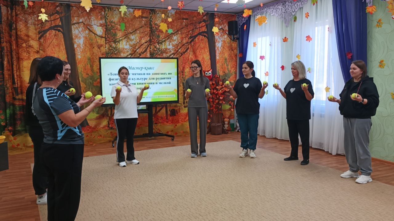 В практической части педагогам были презентованы открытые просмотры физкультурного занятия «Путешествие в осенний лес» (Бондаренко Ю.А., инструктор по физ.культуре) и представлен опыт работы по развитию физических качеств у детей с тяжелыми и множественными нарушениями (Дорогинина Н.П., инструктор по физкультуре). Педагоги стали активными участниками мастер-классов по нейропсихологии движения (Головина Т.О., педагог-психолог), использованию речевых игр на занятиях по физической культуре (подготовила и провела учитель-логопед Шмырева Л.В.); в нетрадиционной форме был проведен мастер-класс «Теннисные мячики на занятиях по физкультуре для развития концентрации внимания и мелкой моторики» (Бондаренко Ю.А., инструктор по физкультуре); МК «Эффективное применение сиббордов как инструмента формирования координации движений у дошкольников» (Дорогинина Н.П.).