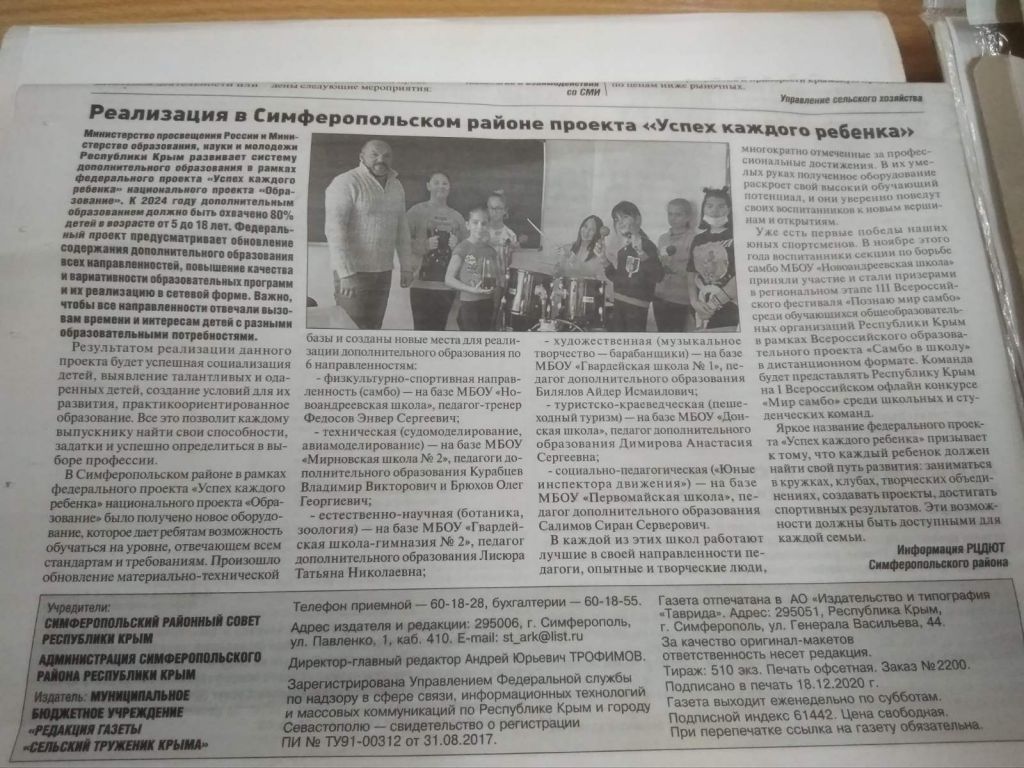 Федеральный проект «Успех каждого ребенка» является одним из основных проектов, реализующихся в рамках национального проекта «Образование». В Симферопольском районе в рамках федерального проекта «Успех каждого ребенка» национального проекта «Образование» получено оборудование, которое даст ребятам возможность обучаться на новом современном уровне, отвечающем всем стандартам и требованиям. Произошло не просто обновление материально-технической базы. Созданы новые места для реализации дополнительной общеобразовательной программы естественнонаучной направленности «Ботаника и зоология» в творческом объединении «Родничок» МБОУ ДО «ЦДЮТ» (на базе МБОУ «Гвардейская школа-гимназия № 2», руководитель Лисюра Татьяна Николаевна).