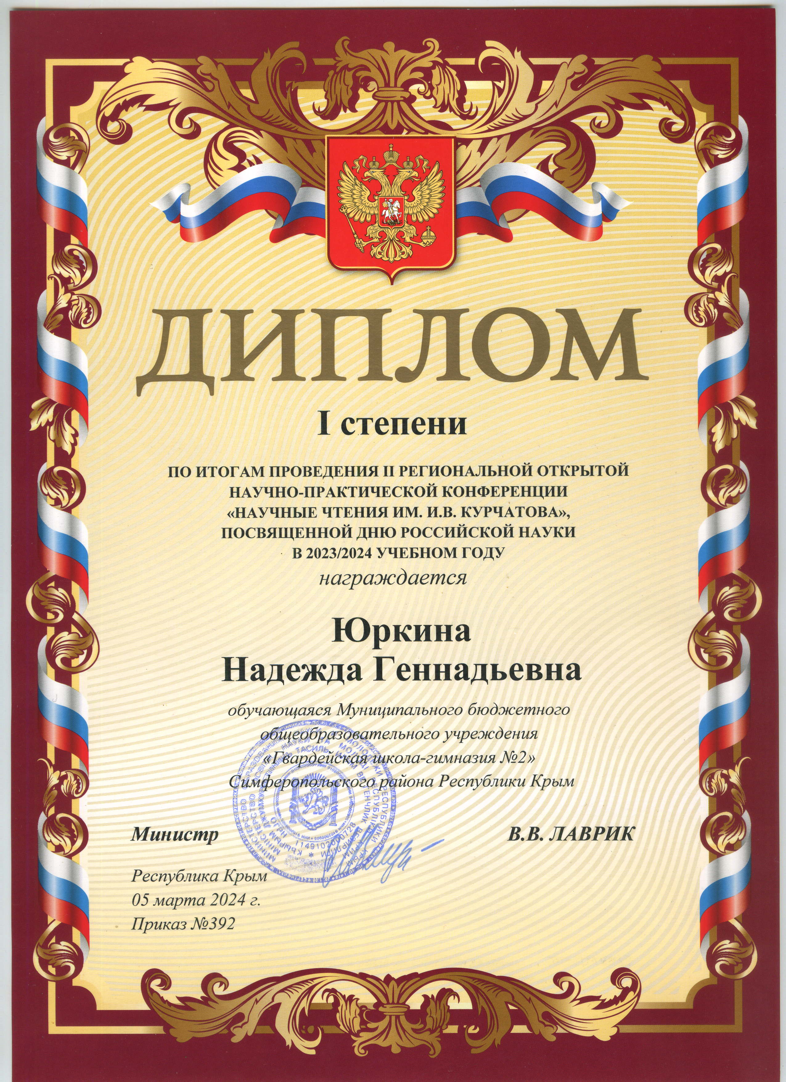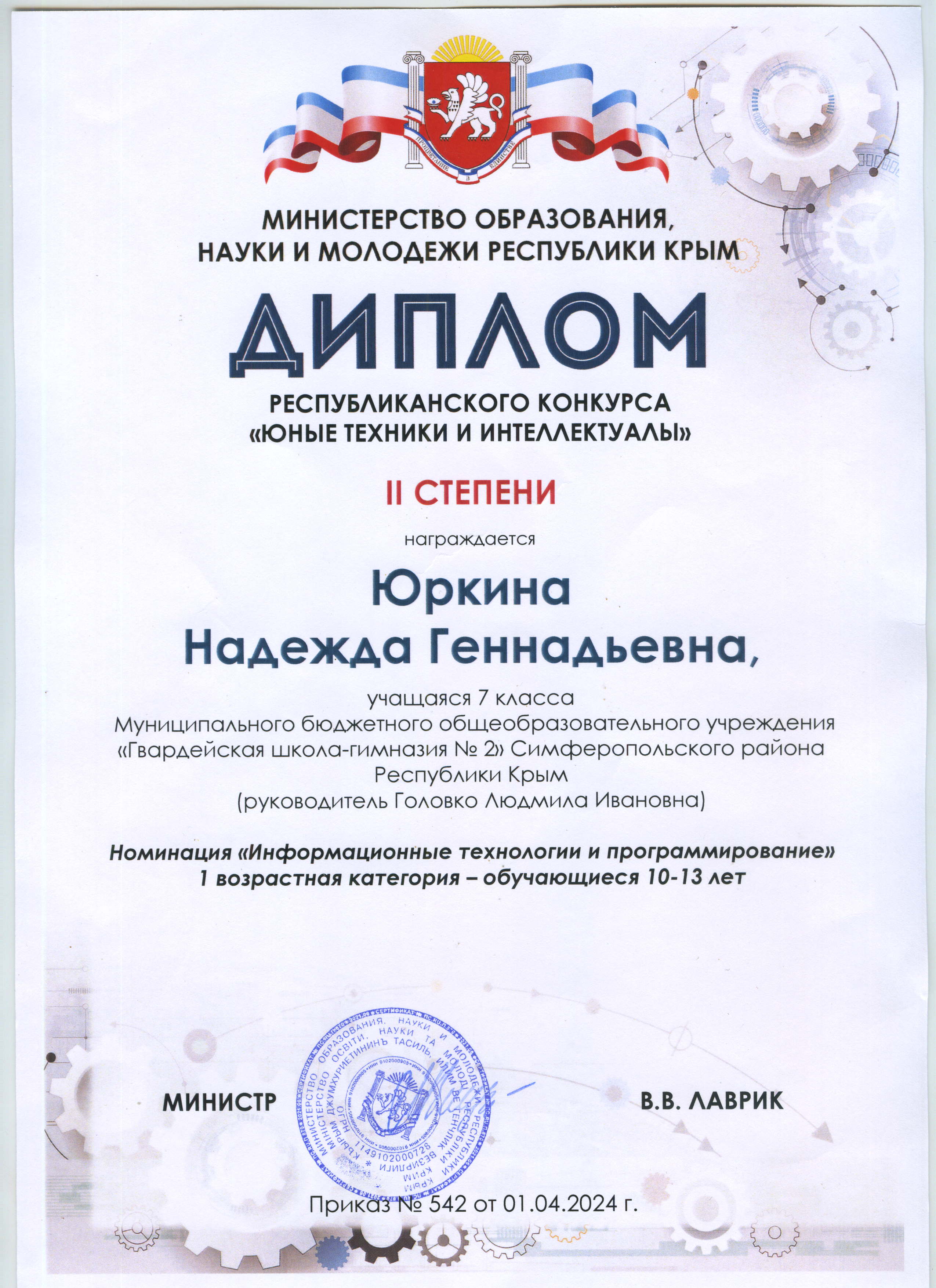 10. Грамота - 2 место в номинации "исследовательские проекты" секция "Я и моё здоровье" муниципального этапа Республиканского конкурса "Первооткрыватель" в 2024 году. Приказ от 01.03.2024г. №240 https://vk.com/wall-217168445_4630