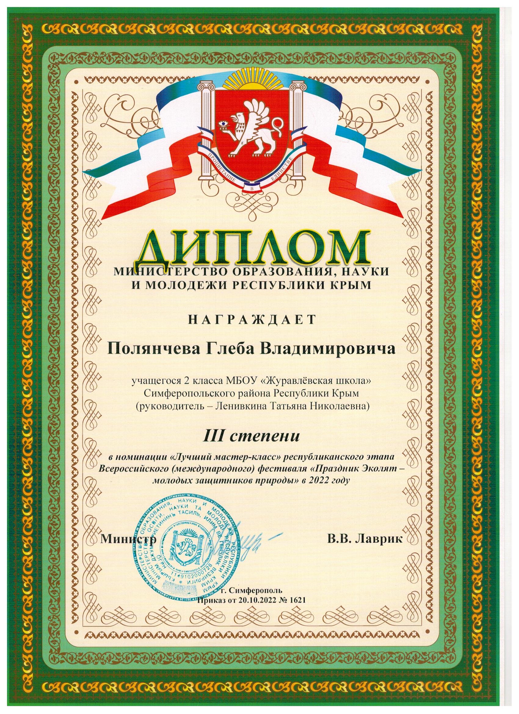 2. Диплом - III степени Республиканского конкурса природоведческих исследовательских проектов "Первооткрыватель" номинация "Окружающий мир" проект "Красная книга Крыма или возьмём под защиту", 2 класс. Приказ от 13.04.2022г. №614