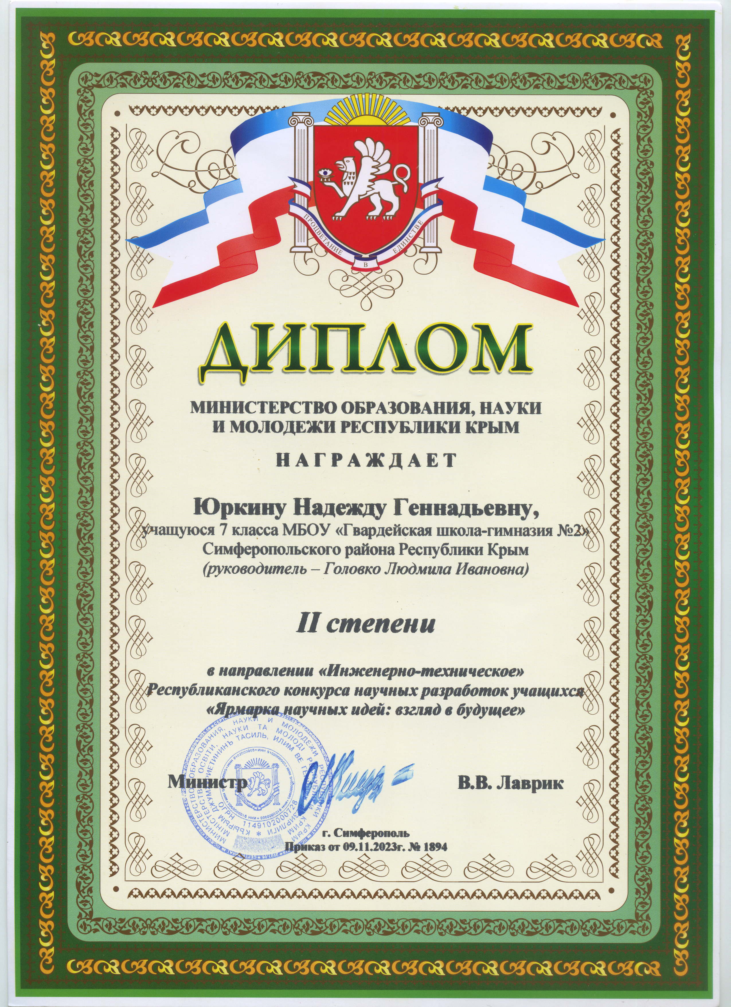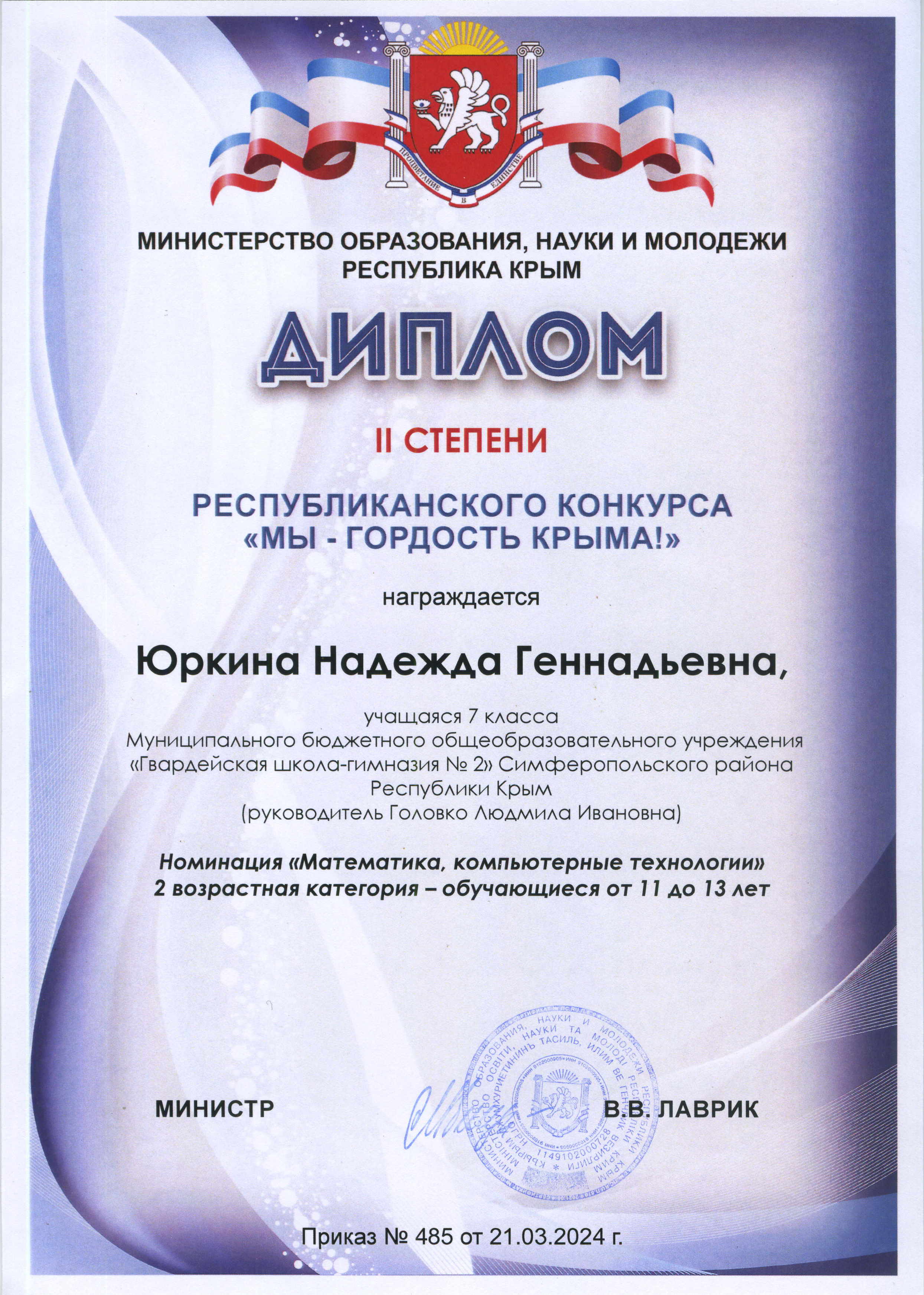 13. Победитель - муниципального этапа Республиканского конкурса "МЫ- гордость Крыма" Приказ от 08.12.2023г. №1084