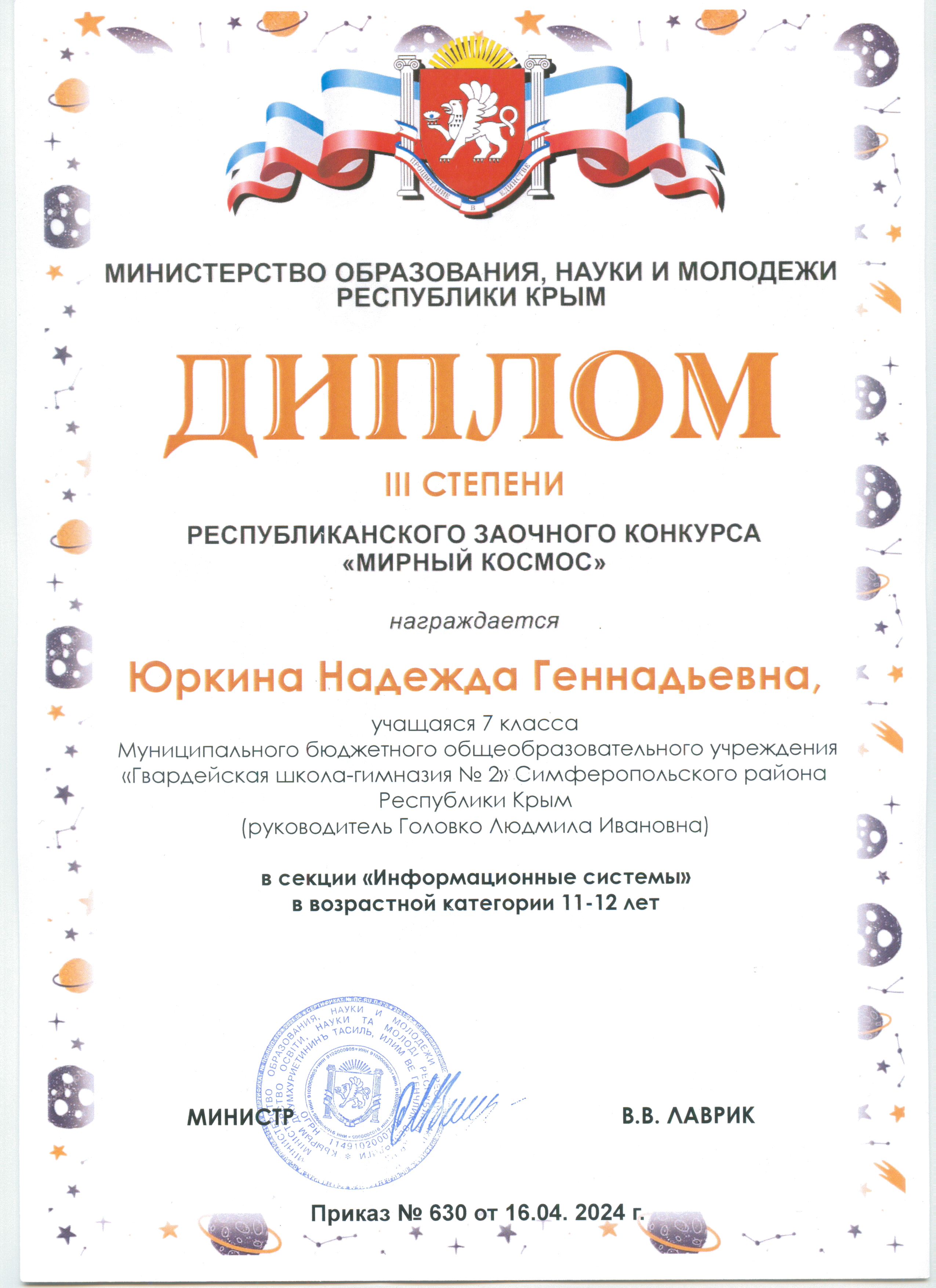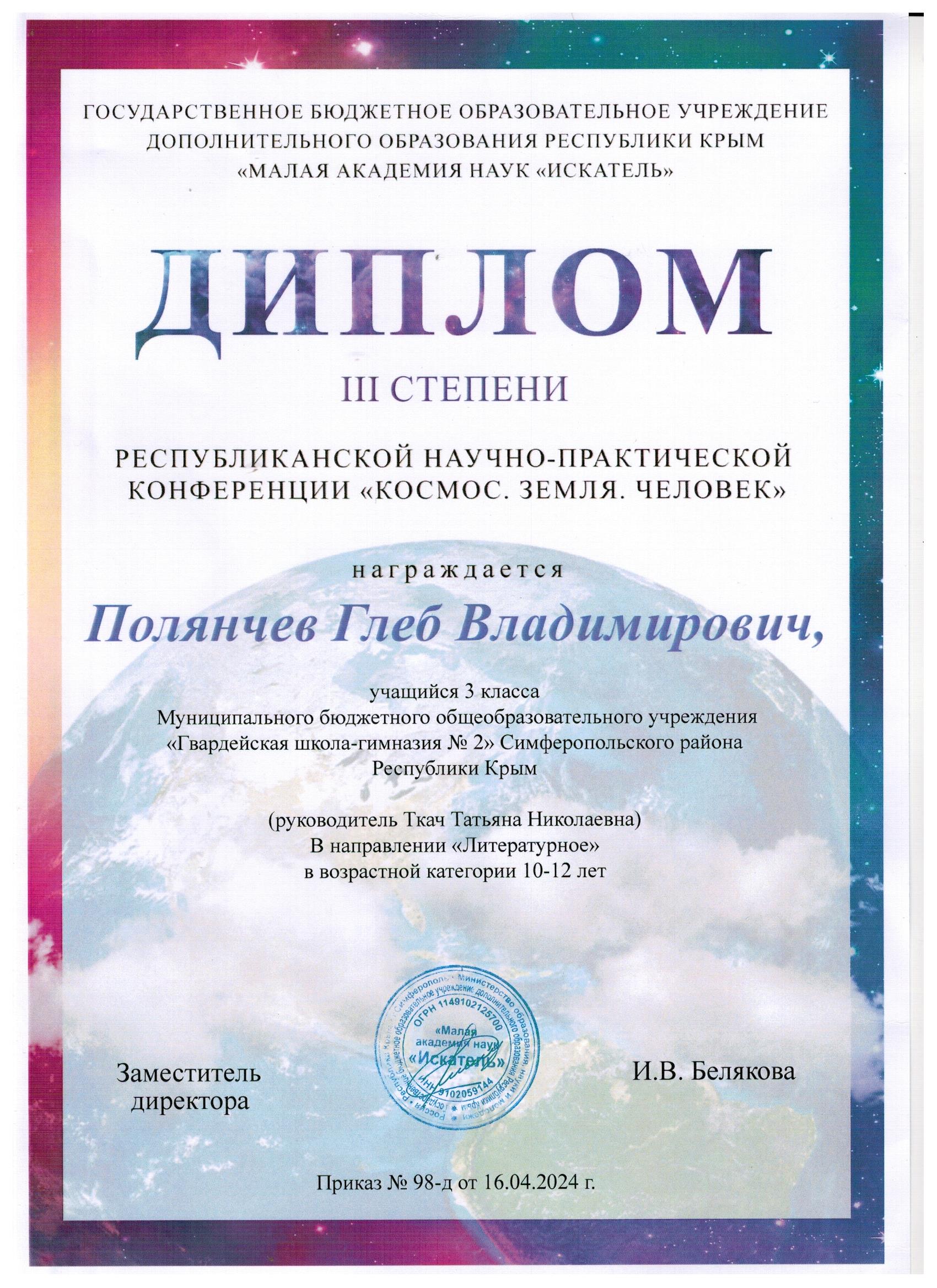 3. Диплом - III степени Республиканской Научно-практической Конференции "Космос. Земля. Человек" направление "Литературное" в возрастной категории 10-12 лет. Приказ от 16.04.2023г. №98 https://vk.com/wall-217168445_5863 https://vk.com/wall-217168445_5177