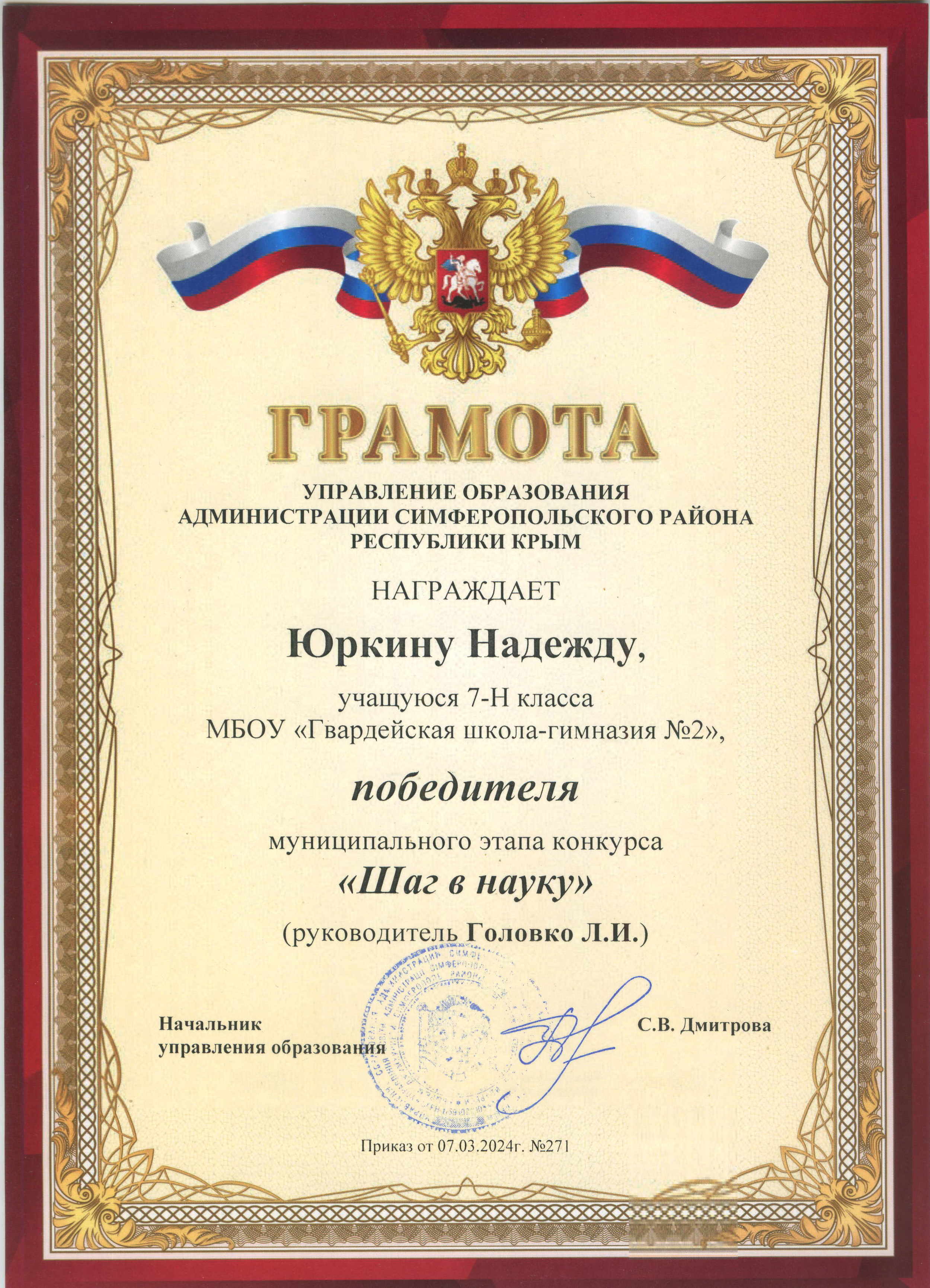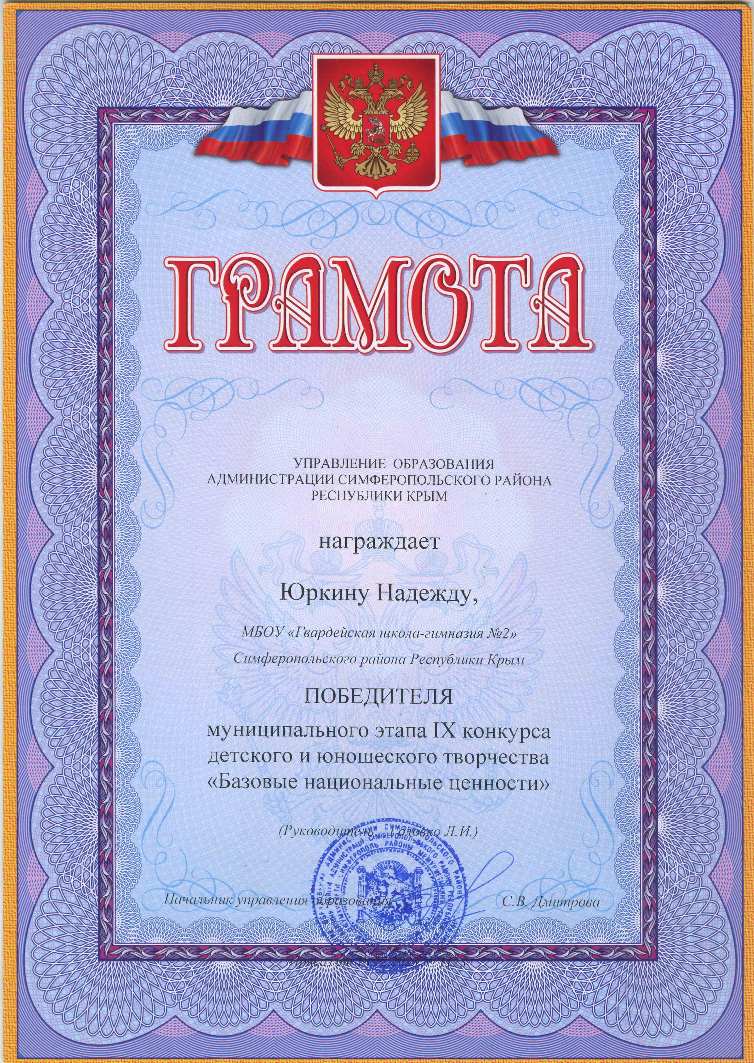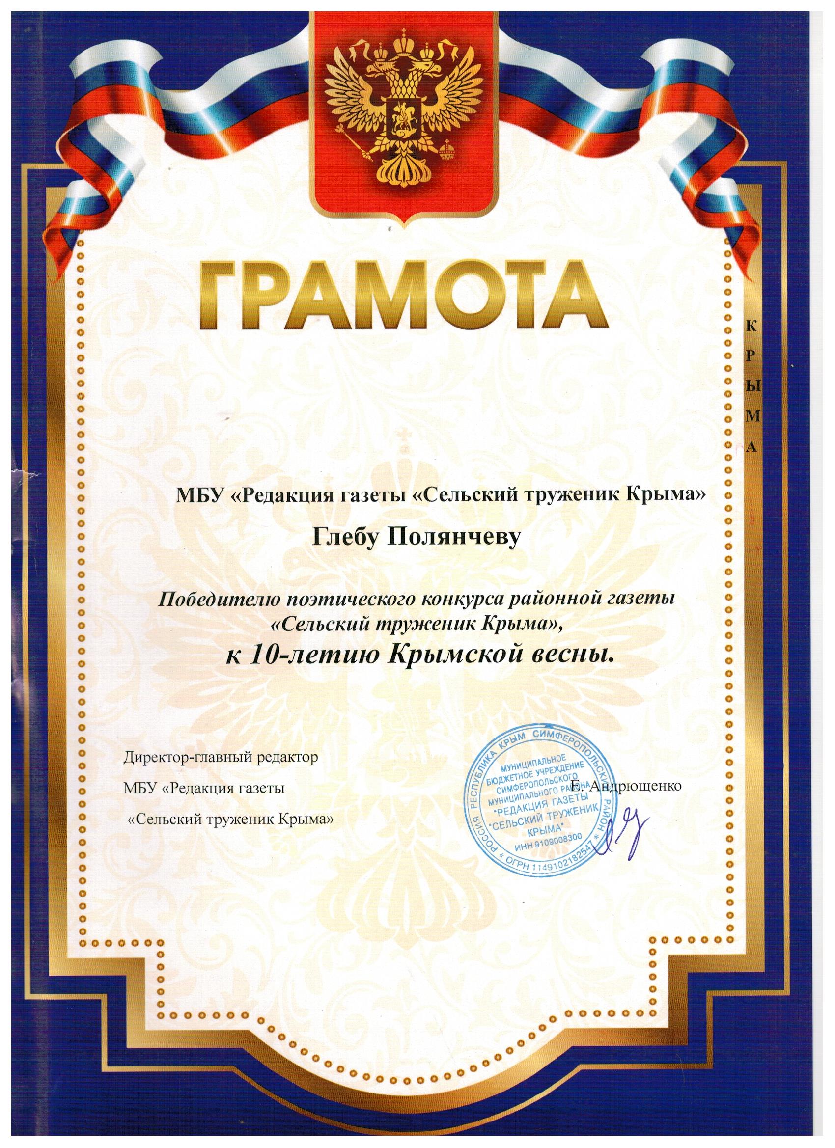 12.Грамота - победитель поэтического конкурса районной газеты "Сельский труженик Крыма", к 10-летию Крымской весны. 2024г. https://vk.com/wall-217168445_5165
