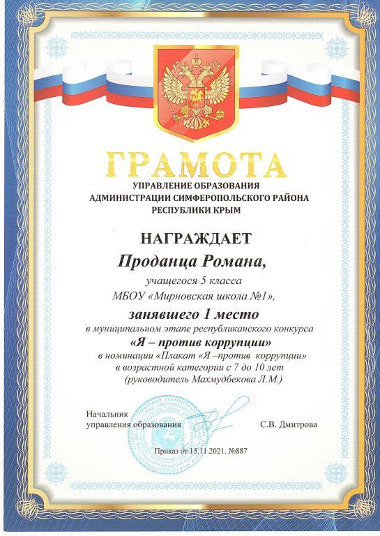 · Диплом 3 степени республиканского конкурса «Я – против коррупции», приказ от 03.12.2021 №1901