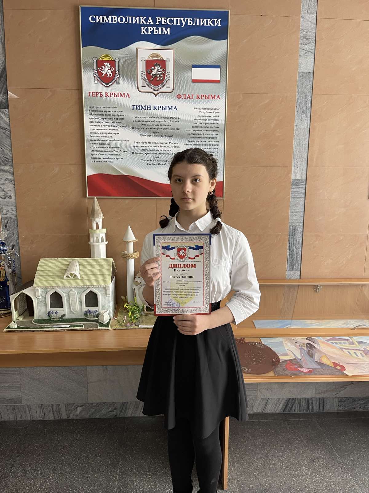4)Республиканский творческий конкурс «Крым-моя родина» («Къырым-меним Ватаным»)- II место в Республике. (Приказ МОНМ РК №556 от 23.03.2023).