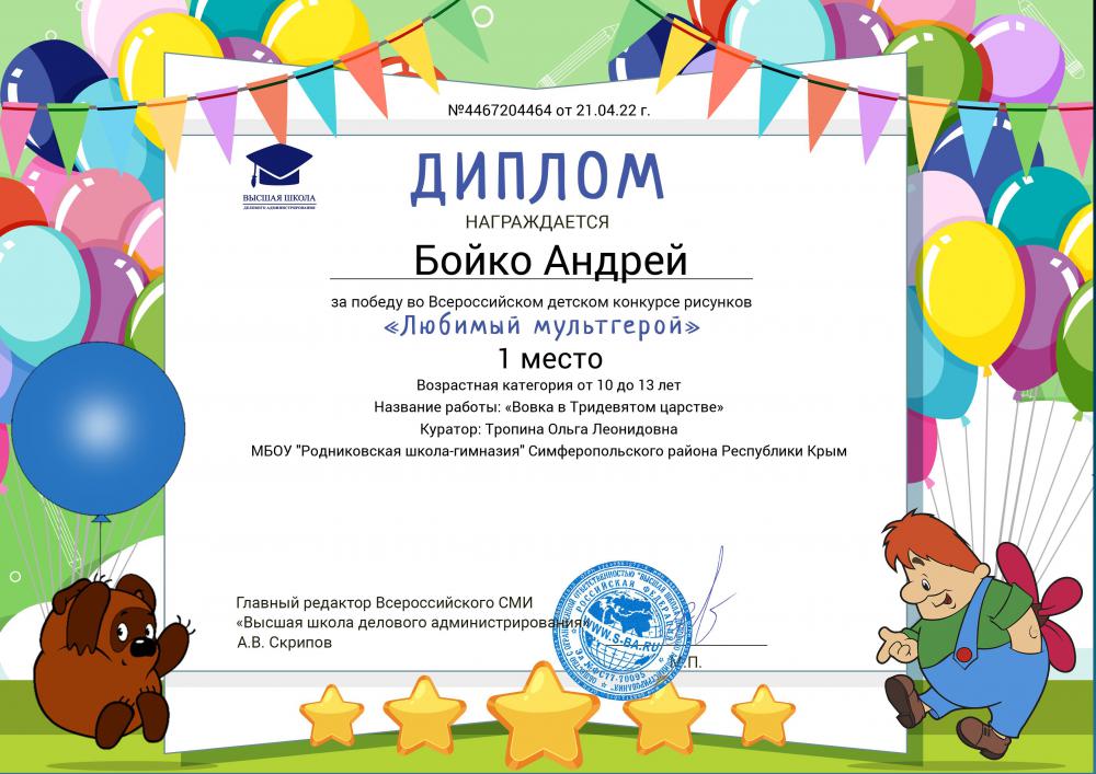 9. I место во Всероссийском детском конкурсе рисунков «Любимый мультгерой».