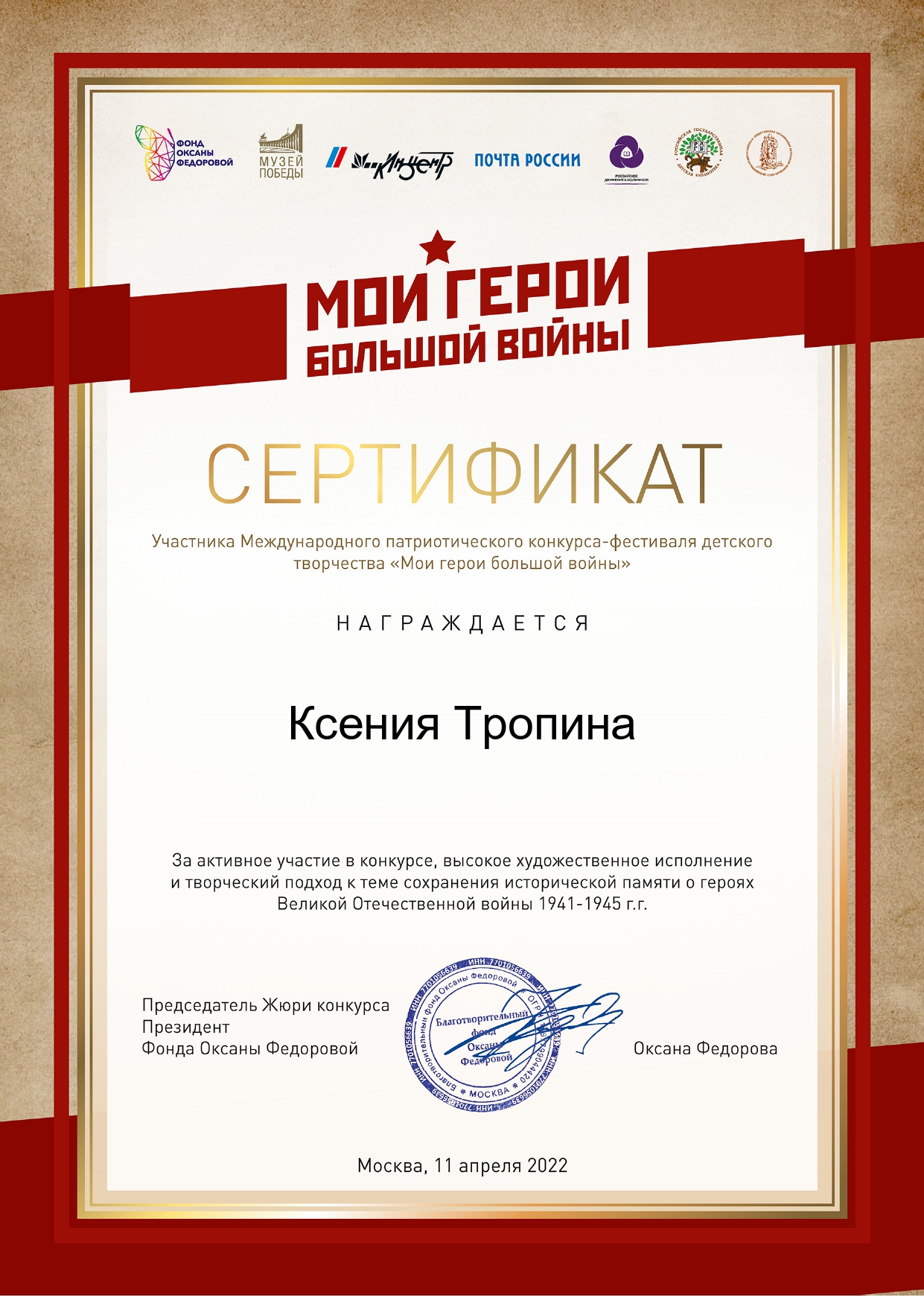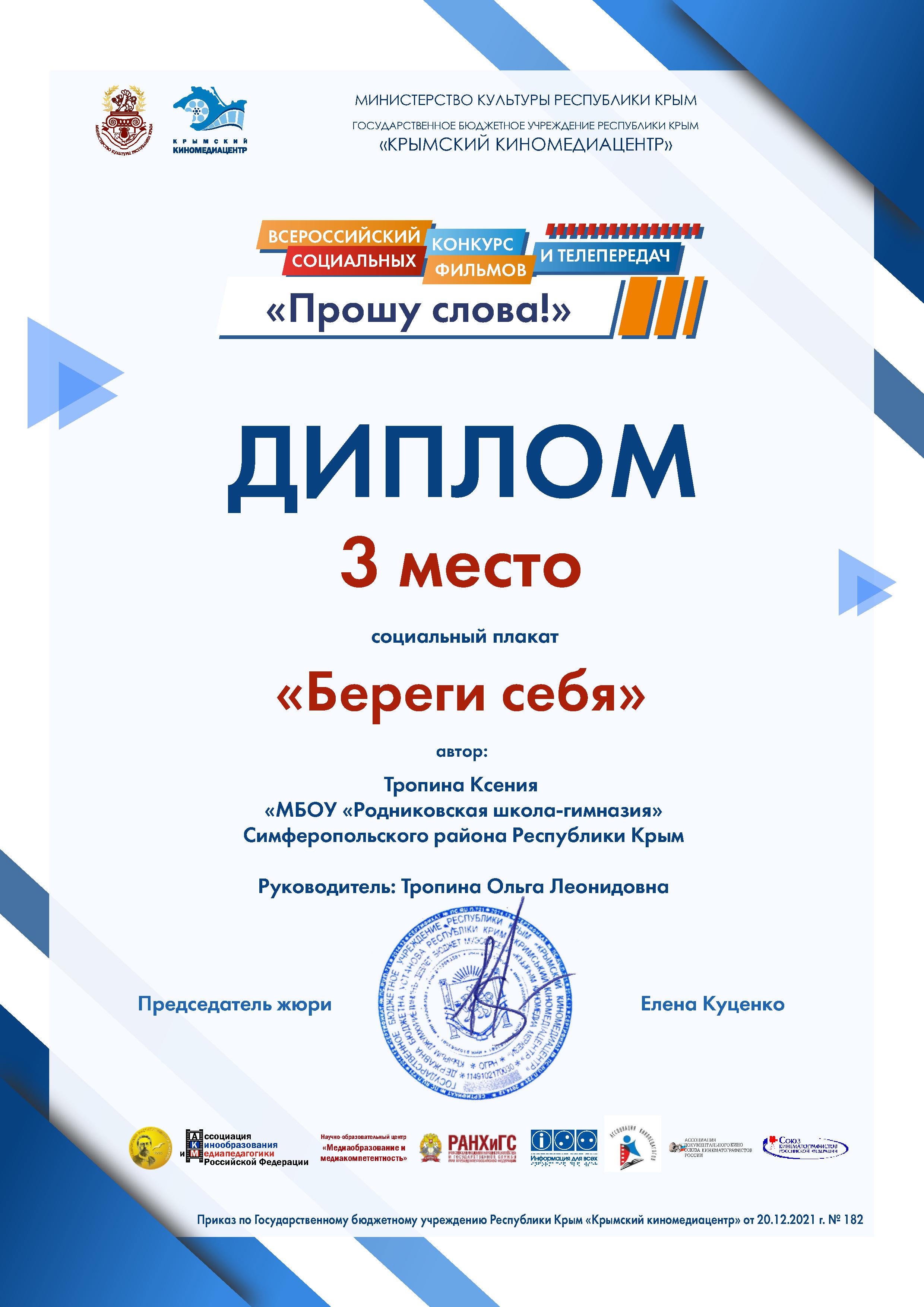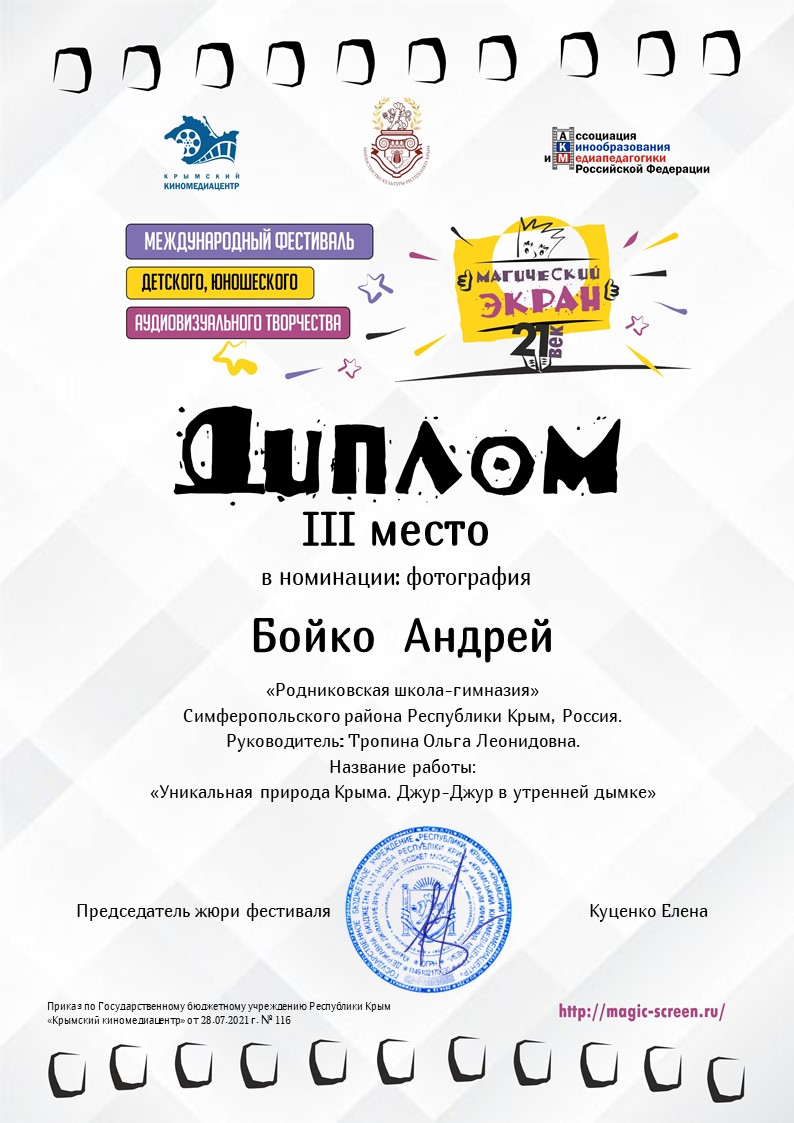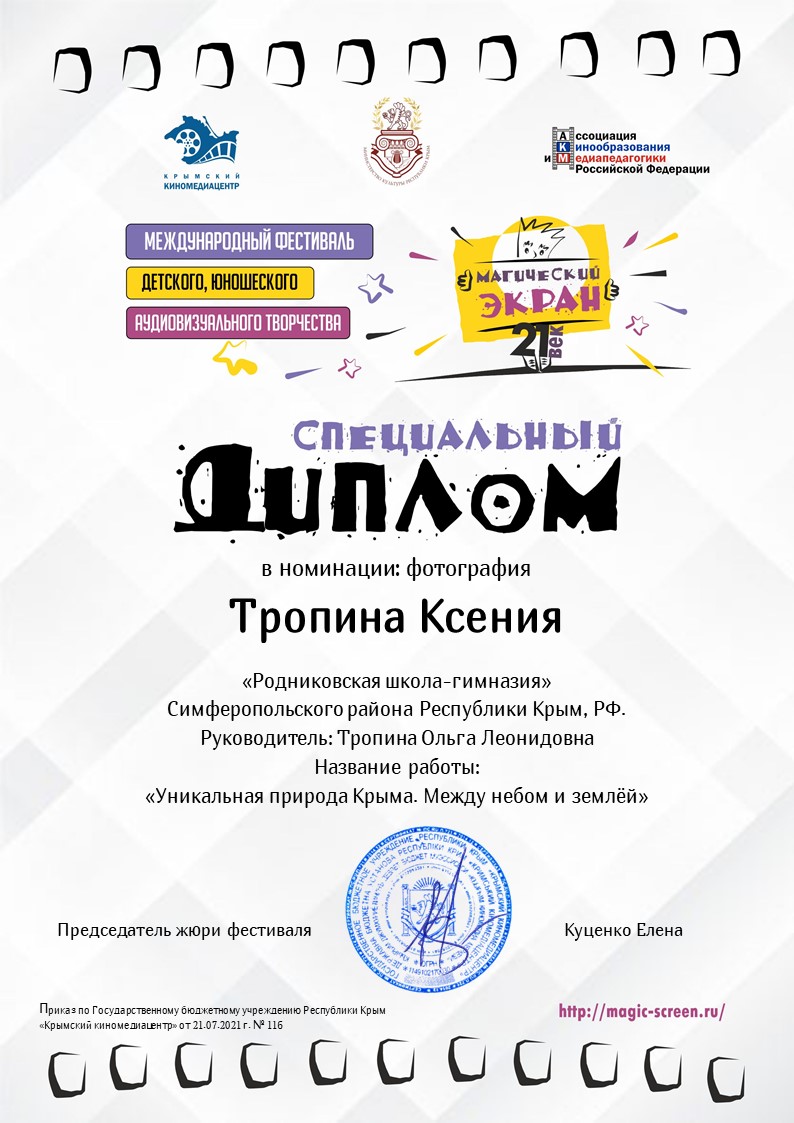 8. Специальный диплом Международного фестиваля детского, юношеского аудиовизуального творчества «Магический экран – 21 век».