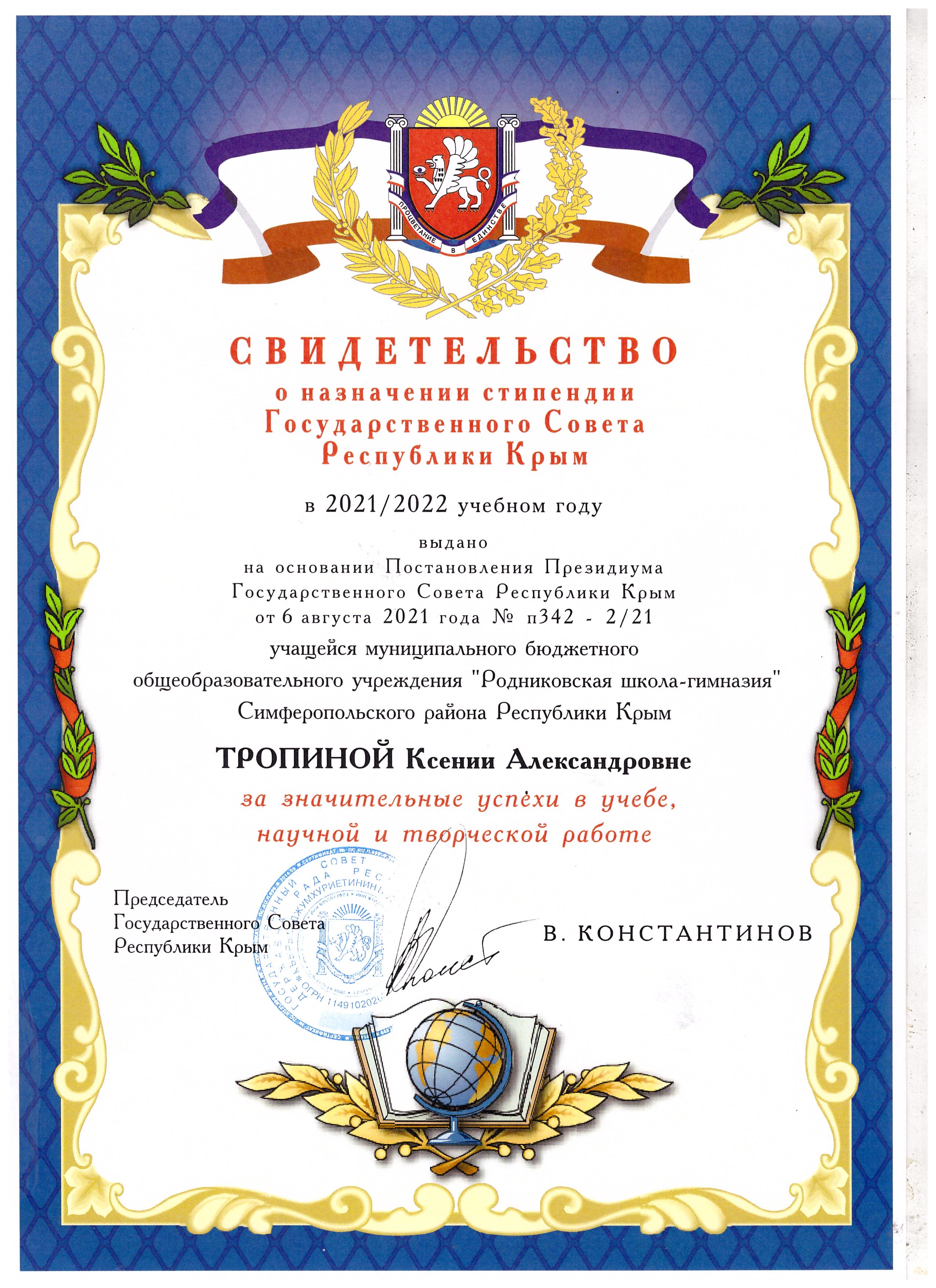 1. Стипендиат Государственного Совета Республики Крым;
