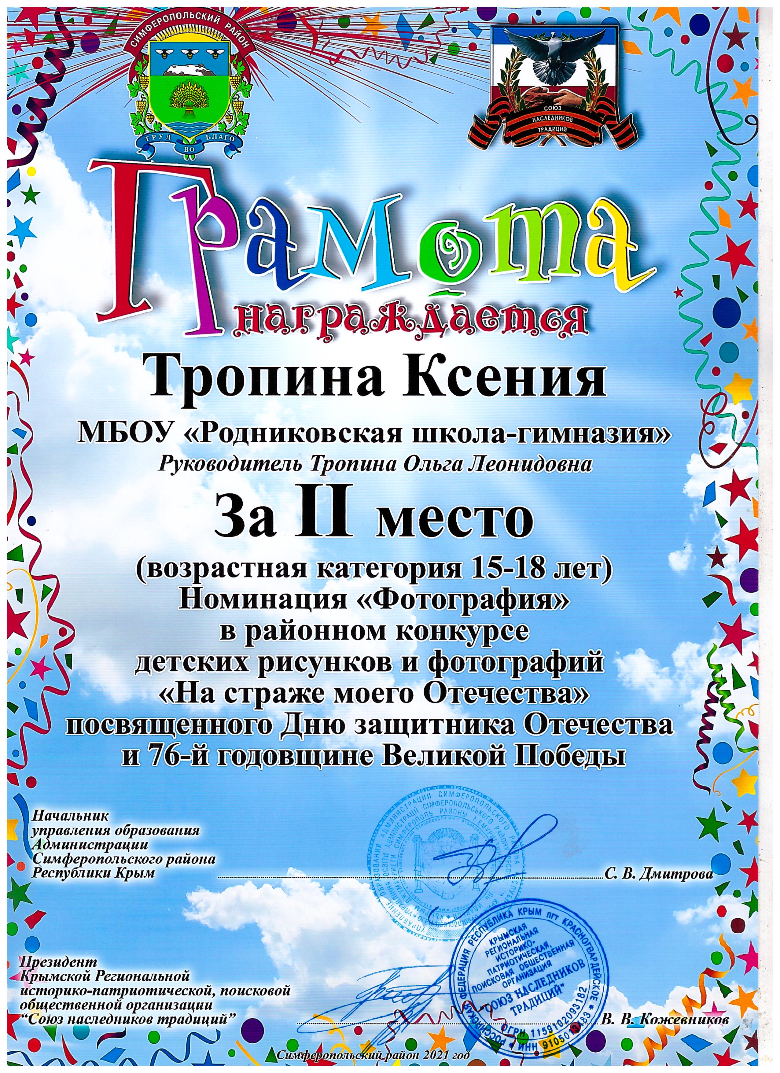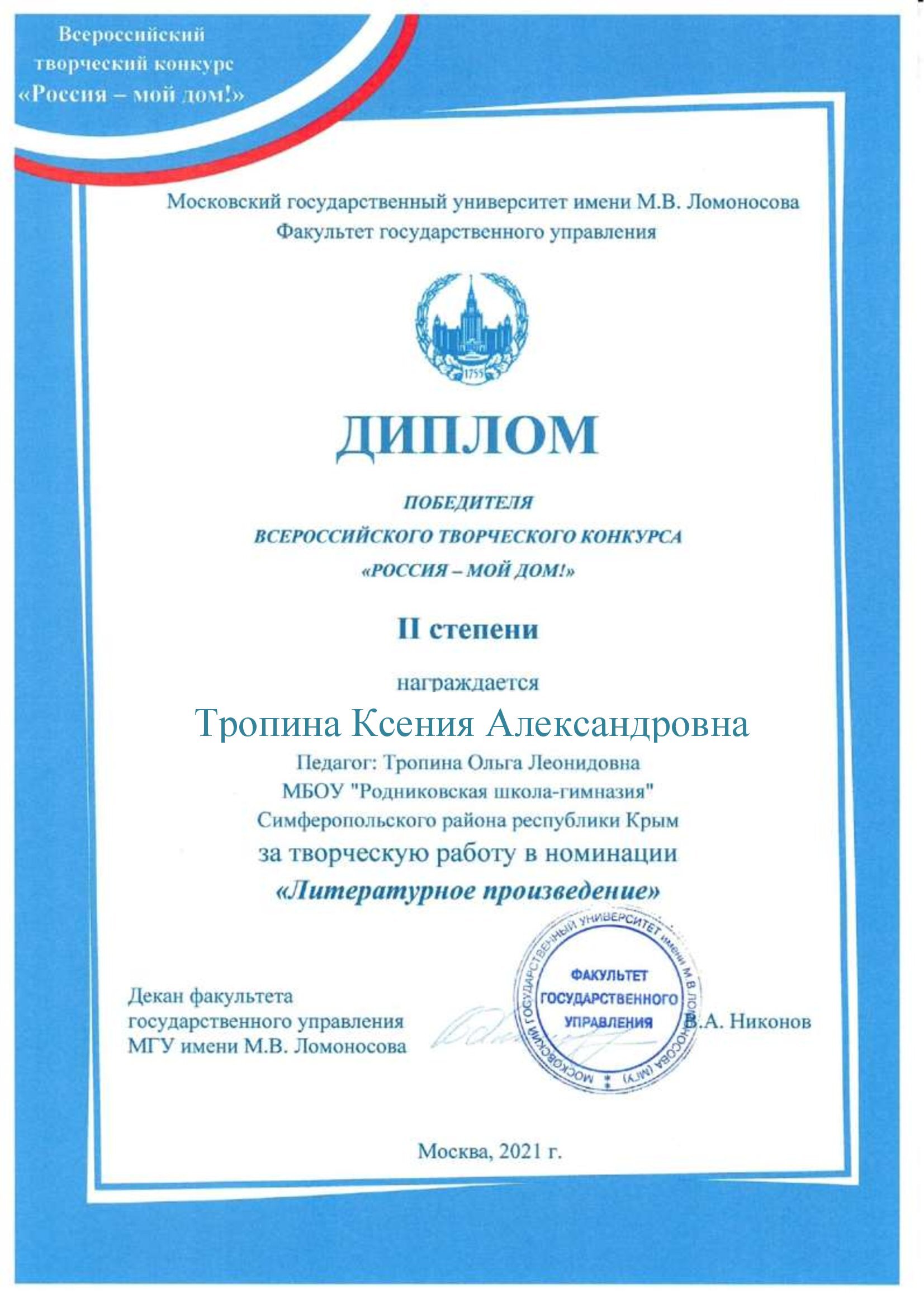 6. II место во Всероссийском творческом конкурсе «Россия – мой дом!» 2021 года (МГУ им. М.В. Ломоносова);