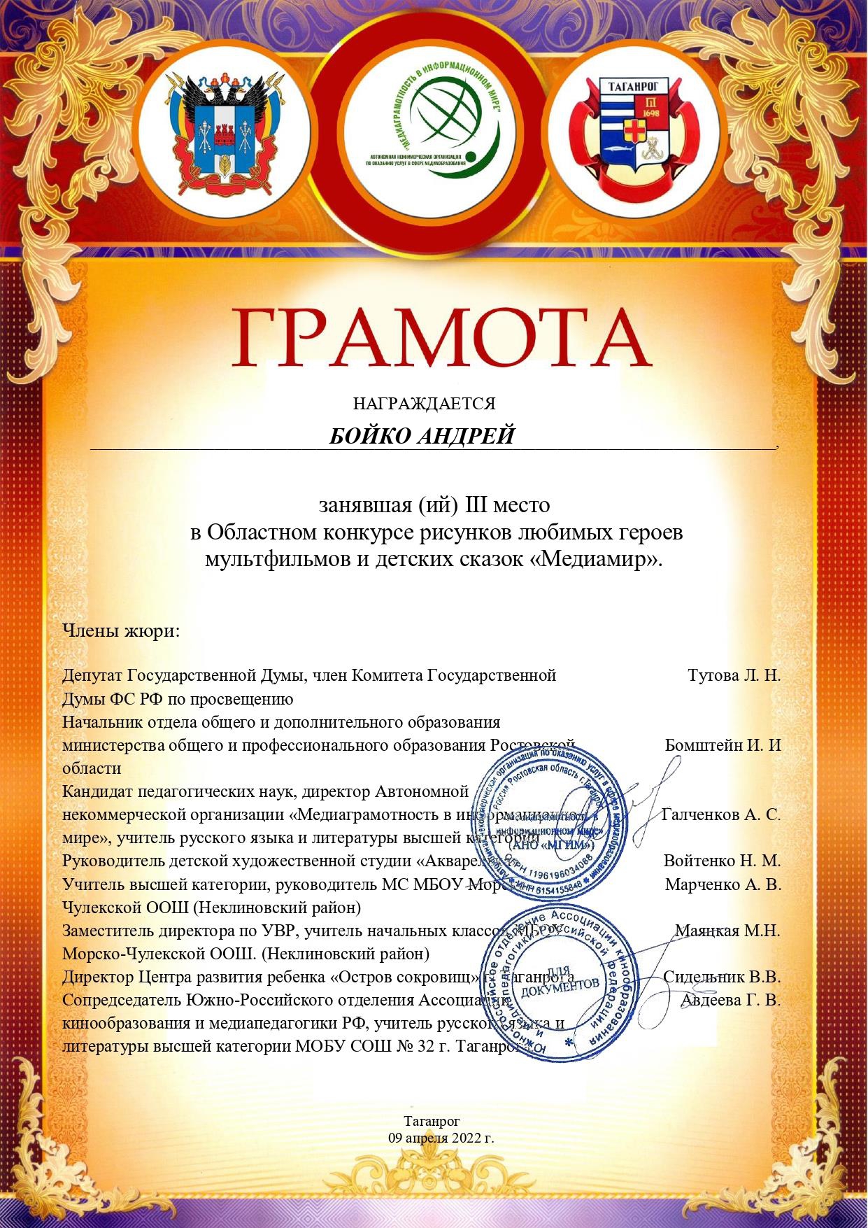 7. III место в областном Конкурсе рисунков любимых героев мультфильмов и детских сказок «Медиамир»;