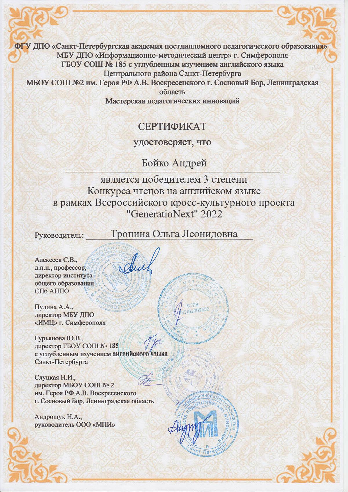 6. Победитель III степени Всероссийского кросс-культурный проекта «Generationext» 2022. Конкурс чтецов на английском языке;