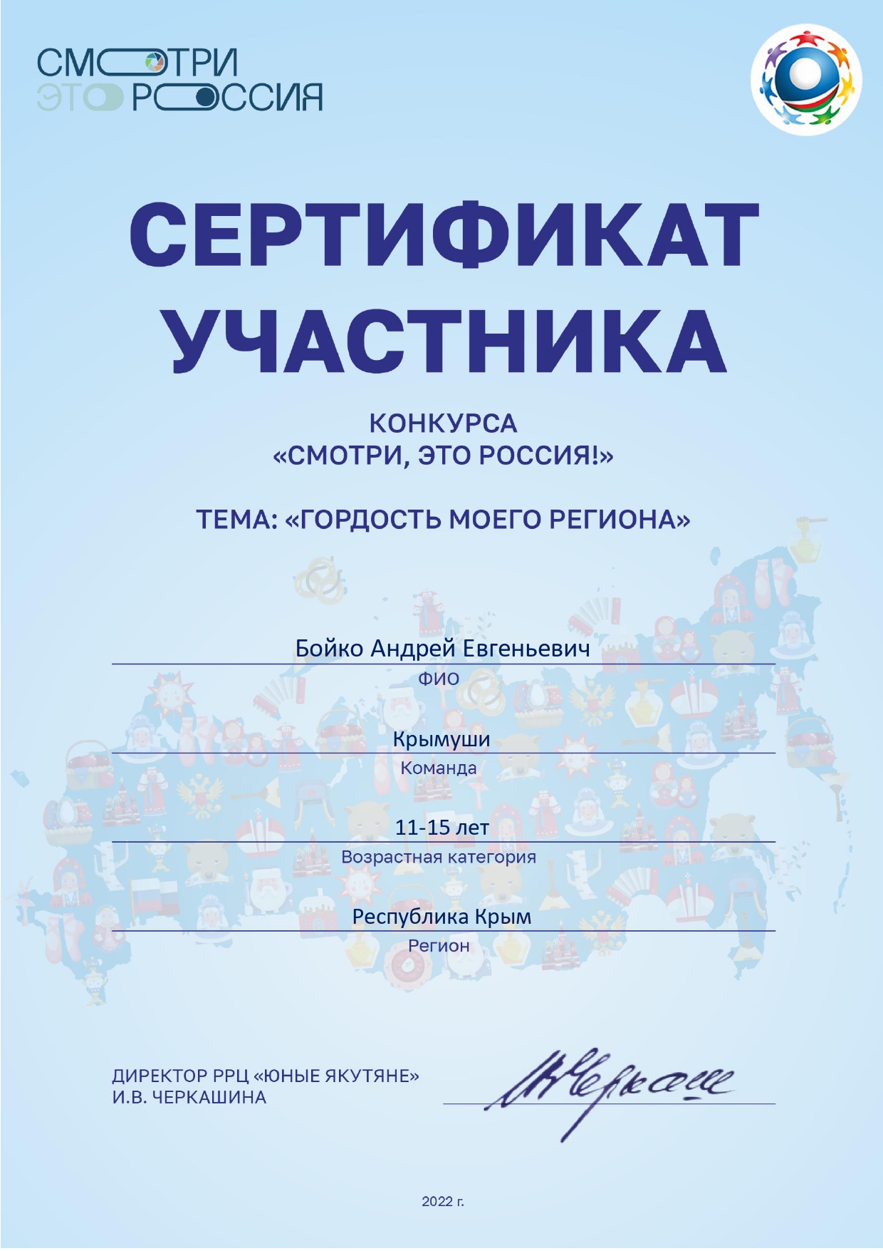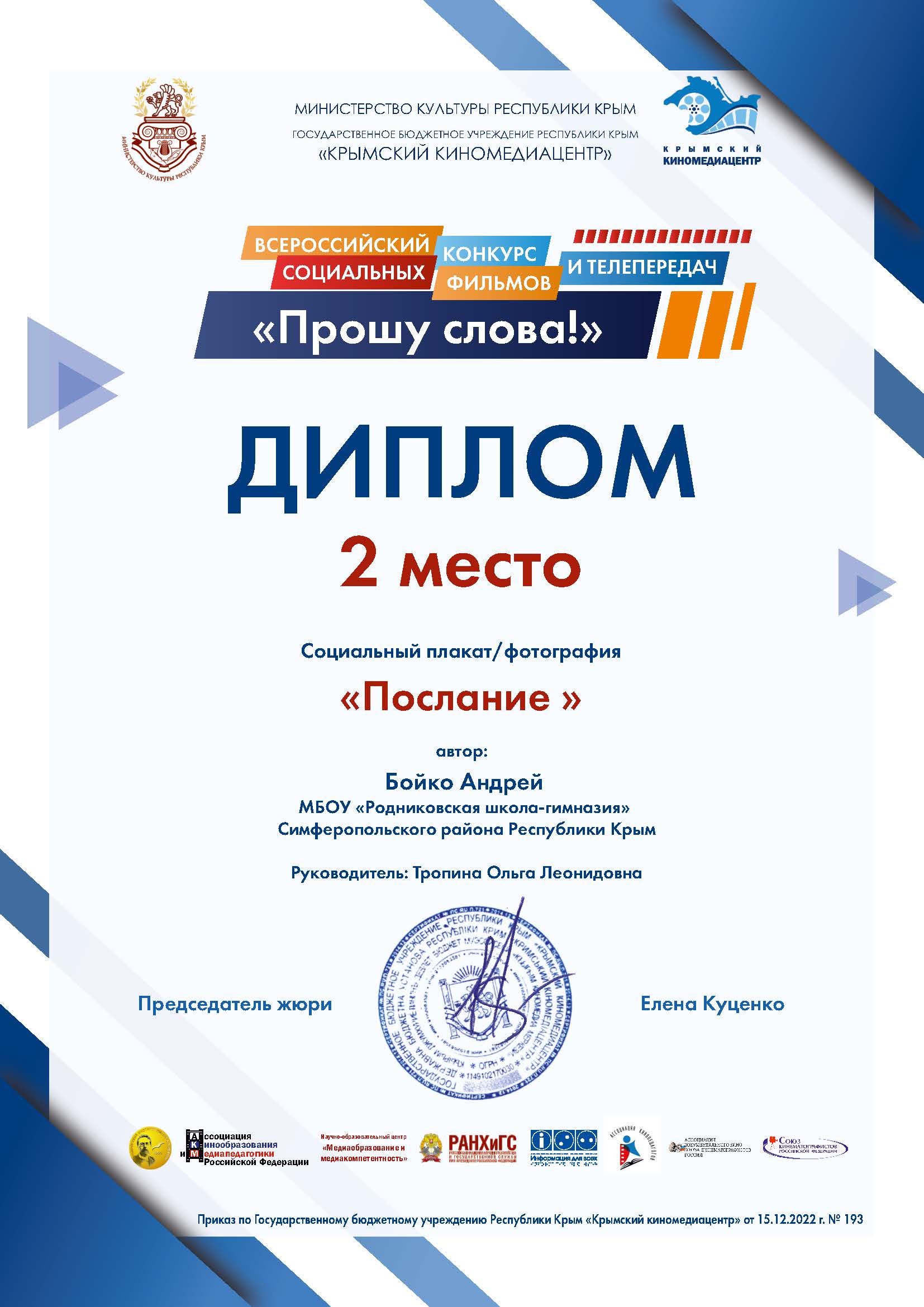 6. Дипломант 2 степени ГБУ РК «Крымский медиацентр» в крымском республиканском конкурсе аудиовизуального творчества «Моя Родина-Крым».
