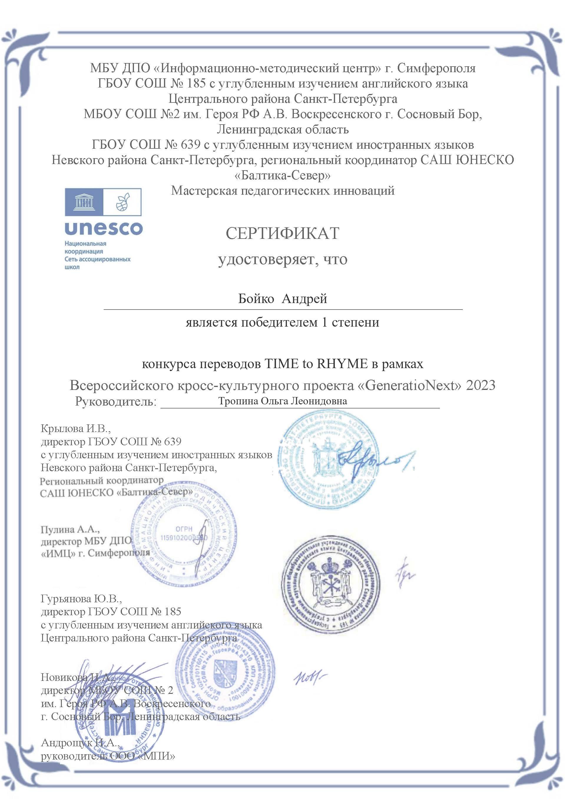5. Победитель I степени Всероссийского кросс-культурный проекта «Generationext» 2023. Конкурс переводов TIME to RHYME;