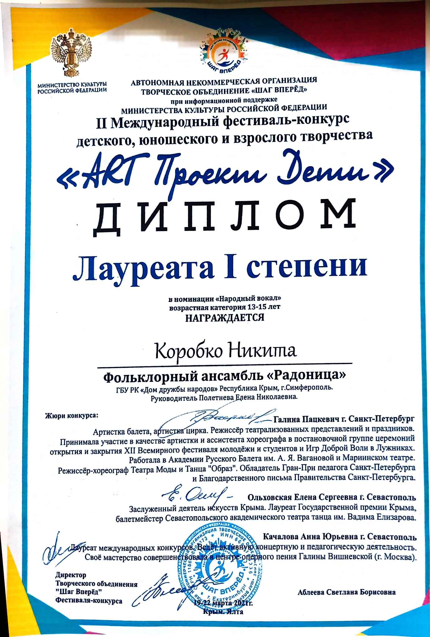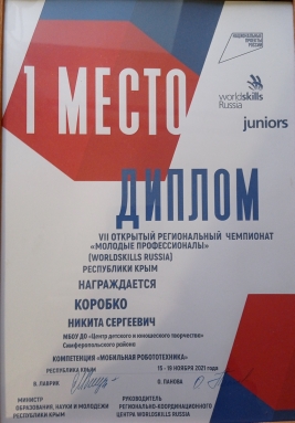 1. Диплом I место в VII открытый чемпионат «Молодые профессионалы» Республики Крым. Компетенция – «Мобильная робототехника»