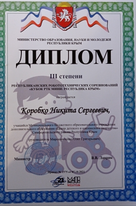 3. Диплом III степени Республиканских робототехнических соревнований «Кубок РТК МИНИ: Республика Крым. Диплом Лауреата I степени.