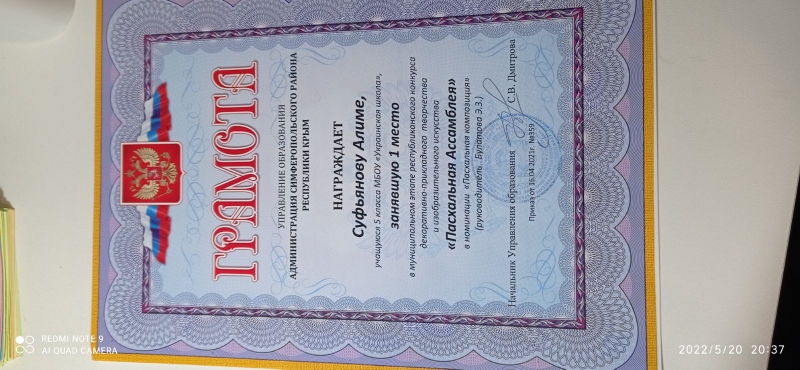Грамота 1 место «Пасхальная Ассамблея» Приказ от 16.04.2021№359- vk.com/alimeeeeeee