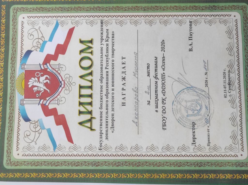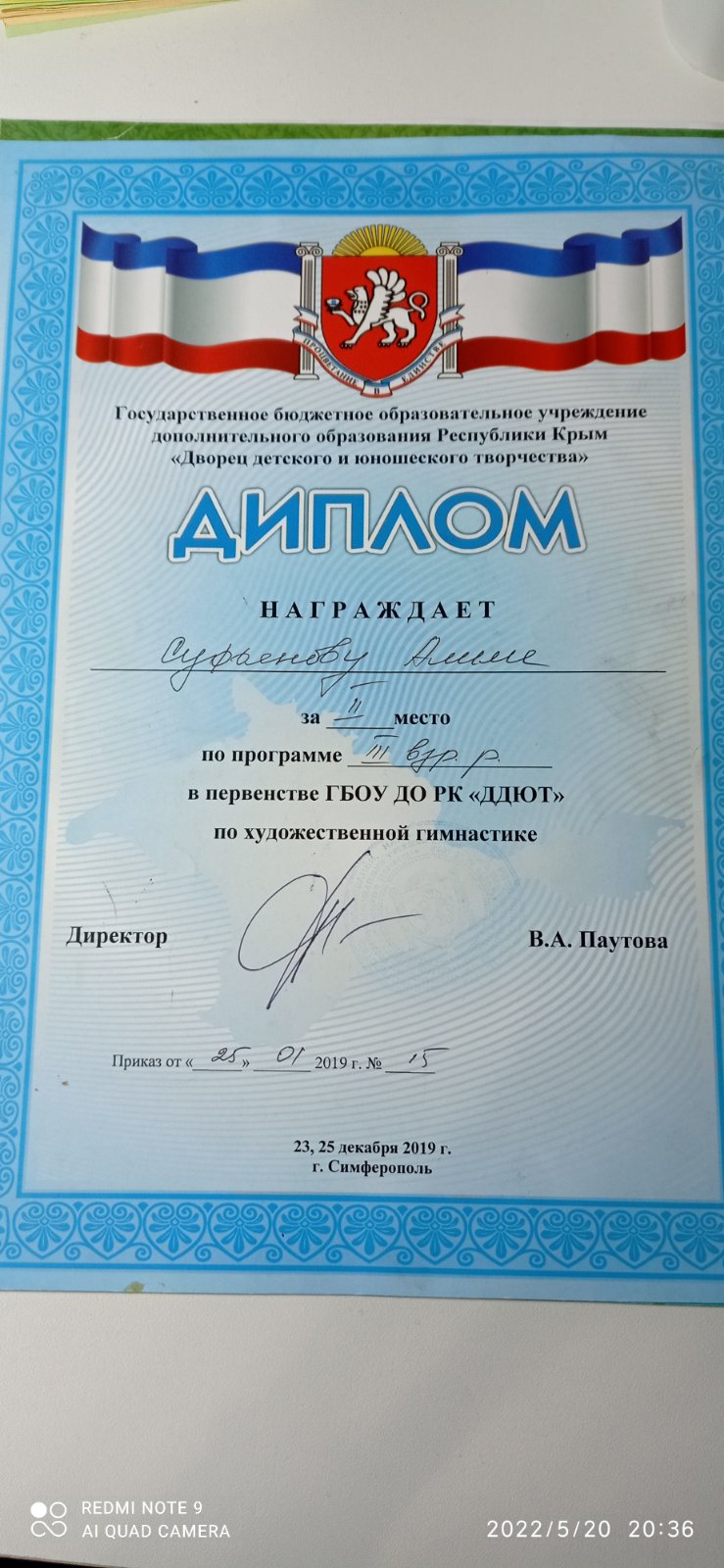 Диплом за 2 место в первенстве ГБОУ ДО РК «ДДЮТ» по художественной гимнастике Приказ от 25.01.2019№15- vk.com/alimeeeeeee